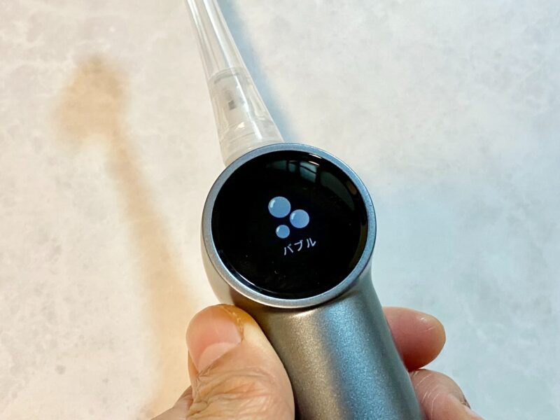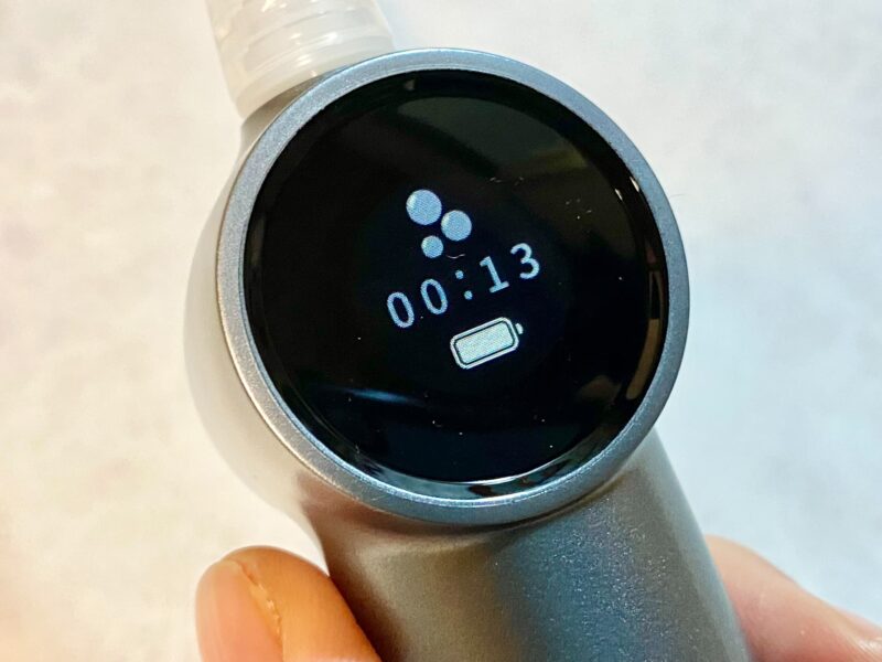 また、気になった点としては、ブラッシング箇所を移動する時間が分かりにくいことです。一般的な電動歯ブラシには、30秒ごとに振動などで知らせてくれるタイマー機能がありますが、AirJet Ⅱにはそのようなシグナルがありません。液晶画面に秒数は表示されるものの、歯磨き中は画面を見ることができないため、次のブラッシング箇所へ移るタイミングがやや分かりにくく感じました。