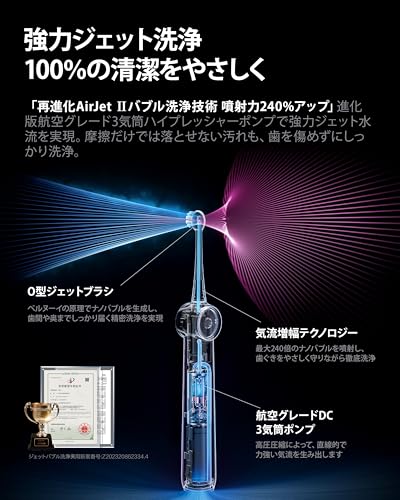 ANVOO AirJet Ⅱは、音波振動による歯ブラシ機能に加えて、ジェット噴射(エア+水流)を同時に行える電動歯ブラシです。